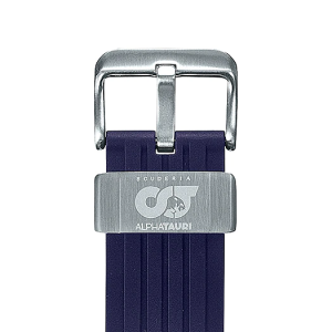 Coloring is in the image of Scuderia AlphaTauri Formula 1 team colors, starting with basic navy blue accented with other hues. The team logo is shown on the dial, case back and band.
