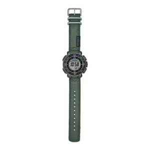 The PRG-340B-3DR features a bold and functional design, characterized by a large, easy-to-read digital display and a sturdy resin case. The watch is predominantly green, with a matte finish that reduces glare, making it suitable for outdoor environments. The black resin strap is both durable and comfortable, ensuring a secure fit during physical activities.